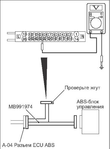 (1) Отсоединить разъем ABS-ECU и подсоединить специальный инструмент жгут проводов для проверки ABS (МВ991974), к разъему со стороны жгута, после чего измерить сопротивление со стороны разъема специального инструмента. ПРИМЕЧАНИЕ: Подсоединять специальный инструмент - жгут проводов для проверки ABS (МВ991974), к ABS-ECU запрещается. (2) Измерить сопротивление между клеммой питания датчика скорости колеса и (сигнальная клемма) №22 и «массой на кузове», а также между клеммой заземления датчика скорости колеса №21 и «массой на кузове». НОРМА: Прерывание ШАГ 6. Измерение сопротивления на разъеме ABS-ECU А-04