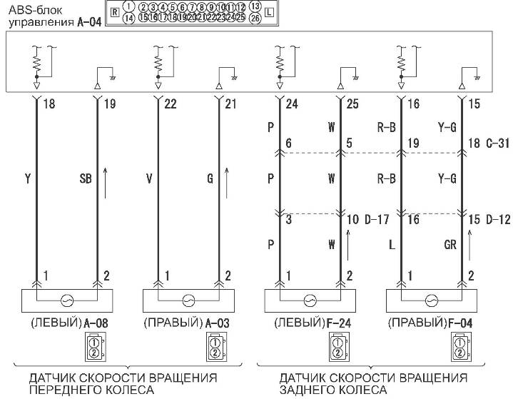 Q: Является ли результат проверки нормальным? ДА : Перейти к Шагу 9. НЕТ (Результат измерений на клемме №24 или №25 не соответствует норме): Перейти к Шагу 7. ШАГ 7. Проверка разъема: разъем ABS-ECU А-04, промежуточные разъёмы С-31 и D-17, разъем датчика скорости <ЗЛ> колеса F-24 ШАГ 8. Проверка жгута электропроводки между клеммой №24 разъема ABS-ECU А-04, и клеммой №1 разъема датчика скорости <ЗЛ> колеса F-24, а также между клеммой №25 разъема ABS-ECU А-04, и клеммой №2 разъема датчика скорости <ЗЛ> колеса F-24. • Проверить наличие короткого замыкания в цепи датчика скорости <ЗЛ> колеса. Q: Является ли результат проверки нормальным? ДА : Заменить датчик скорости <ЗЛ> колеса. НЕТ : Отремонтировать жгут электропроводки. ШАГ 9. Измерение напряжения на разъеме ABS-ECU А-04