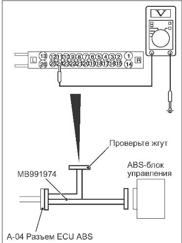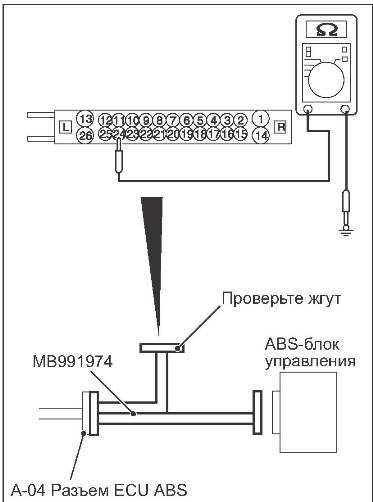 (1) Отсоединить разъем ABS-ECU и подсоединить специальный инструмент жгут проводов для проверки ABS (МВ991974), к разъему со стороны жгута, после чего измерить сопротивление со стороны разъема специального инструмента. ПРИМЕЧАНИЕ: Подсоединять специальный инструмент - жгут проводов для проверки ABS (МВ991974), к ABS-ECU запрещается. (2) Измерить сопротивление между клеммой питания датчика скорости колеса и (сигнальная клемма) №24 и «массой на кузове», а также между клеммой заземления №25 и «массой на кузове». НОРМА: Прерывание ШАГ 6. Измерение сопротивления на разъеме ABS-ECU А-04