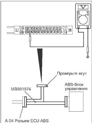 (1) Отсоединить разъем ABS-ECU и подсоединить специальный инструмент жгут проводов для проверки ABS (МВ991974), к разъемам со стороны ABS-ECU и со стороны жгута, после чего измерить напряжение со стороны разъема специального инструмента. (2) Перевести переключатель зажигания в положение ВКЛ. (3) Измерить напряжение между между клеммой питания датчика скорости колеса и (сигнальная клемма) №24 и «массой на кузове». НОРМА: Напряжение в системе ШАГ 10. Проверка жгута электропроводки между клеммой №24 разъема ABS-ECU А-04, и клеммой №1 разъема датчика скорости <ЗЛ> колеса F-24, а также между клеммой №25 разъема ABS-ECU А-04, и клеммой №2 разъема датчика скорости <ЗЛ> колеса F-24. • Проверить наличие обрыва цепи датчика скорости <ЗЛ> колеса. Q: Является ли результат проверки нормальным? ДА: Перейти к Шагу 11. НЕТ : Отремонтировать жгут электропроводки. ШАГ 11. Проверка датчика скорости колеса как единого узла