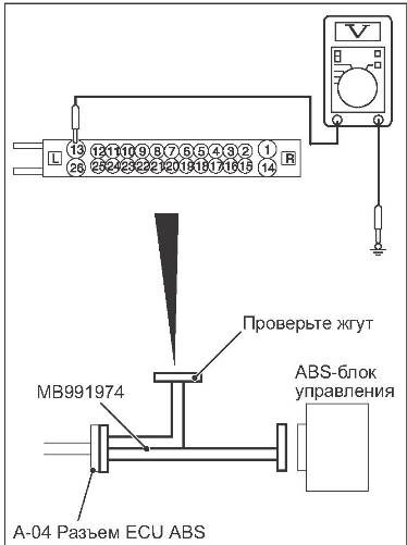 ОСТОРОЖНО Если в шине CAN есть какая-либо неисправность, может быть выдан неверный код диагностики. Прежде чем выполнять эту диагностику, следует продиагностировать шину CAN (54С, Анализ кодов диагностики неисправностей 54С-18). РАБОТА • В ABS-ECU предусмотрена цепь питания (клемма №13) электродвигателя для привода насоса. Энергия на электродвигатель для привода насоса подается от датчика электродвигателя, являющегося частью ABS-ECU. • Датчик электродвигателя для привода насоса, являющегося частью ABS-ECU, всегда выключен, за исключением тех случаев, когда при запуске двигателя транспортного средства идет рабочая проверка ABS или проверка электромагнитного клапана электродвигателя. • ABS-ECU запускает электродвигатель для привода насоса включением датчика электродвигателя, являющегося частью ABS-ECU. УСЛОВИЯ ПОЯВЛЕНИЯ КОДОВ ДИАГНОСТИКИ Если во время или после окончания работы электродвигателя для привода насоса перепад напряжения на его датчике слишком высок, работа электродвигателя останавливается и выдается данный код диагностики. ВОЗМОЖНЫЕ ПРИЧИНЫ Текущая неисправность • Неисправность плавкой перемычки • Поврежден жгут электропроводки или разъемы • Ненормальная работа аккумуляторной батареи или генератора переменного тока • Неисправность ABS-ECU Прошлая неисправность • Выполнить диагностику, уделяя особое внимание неисправностям жгута электропроводки и разъемов на участке между цепью питания (клемма №26 разъема ABS-ECU А-04) и электродвигателем ABS-ECU или цепью заземления (клемма №1 разъема ABS-ECU А-04). Процедура диагностики описана в разделе Что делать с прошлыми неисправностями (ГРУППА 00 Что делать с периодическими неисправностями 5). ПРОЦЕДУРА ДИАГНОСТИКИ ШАГ 1. Диагностика шины CAN с помощью M.U.T.-III Диагностика шины CAN проводится с помощью M.U.T.-III. Q: Является ли результат проверки нормальным? ДА : Перейти к Шагу 3. НЕТ : Отремонтировать шину CAN (54С - Таблица диагностики шины CAN По завершении перейти к Шагу 2. ШАГ 2. Проверка сброса кода диагностики. Q: Выдается ли код диагностики № С1073? ДА : Перейти к Шагу 3. НЕТ: Диагностика завершена. ШАГ 3. Проверка плавкой перемычки: Проверить плавкую перемычку №26. Q: Является ли результат проверки нормальным? ДА : Перейти к Шагу 4. НЕТ : Заменить плавкую перемычку №26. ШАГ 4. Проверка аккумуляторной батареи (54А - Проверка аккумуляторной батареи .) Q: Находится ли аккумуляторная батарея в хорошем состоянии? ДА : Перейти к Шагу 5. НЕТ : Зарядить или заменить аккумуляторную батарею. ШАГ 5. Проверка системы зарядки (16 - Система зарядки Q: Находится ли система зарядки в хорошем состоянии? ДА : Перейти к Шагу 6. НЕТ : Отремонтировать или заменить соответствующий компонент(ы) системы зарядки. (1) Отсоединить разъем ABS-ECU и подсоединить специальный инструмент жгут проводов для проверки ABS (МВ991974), к разъему со стороны жгута, после чего измерить напряжение со стороны разъема специального инструмента. ПРИМЕЧАНИЕ: Подсоединять специальный инструмент - жгут проводов для проверки ABS (МВ991974), к ABS-ECU запрещается. (2) Перевести переключатель зажигания в положение ВКЛ. (3) Измерить напряжение на участке между клеммой №13 и «массой на кузове». НОРМА: Приблизительное напряжение аккумуляторной батареи Q: Является ли результат проверки нормальным? ДА : Перейти к Шагу 8. НЕТ : Перейти к Шагу 7. ШАГ 7. Проверка разъема: Разъем ABS-ECU А-04 Q: Является ли результат