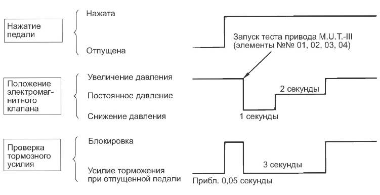 Проверка узла гидросистемы при разрядке батареи1. Поднять транспортное средство с помощью домкрата и установить на упор в указанных точках. ОСТОРОЖНО Прежде чем подключать или отключать M.U.T.-III следует обязательно перевести переключатель зажигания в положение «БЛОКИРОВКА» (ВЫКЛ). 2. Прежде чем проводить настройку M.U.T.-III следует обязательно перевести переключатель зажигания в положение «БЛОКИРОВКА» (ВЫКЛ). 3. Убедиться, что рукоятка переключения находится в положении «N», после чего запустить двигатель. 4. Проверки привода от 01 до 04 выполняются с помощью M.U.T.-III при нажатой педали тормоза. В ходе проверок следует пробовать вращать колеса вручную, чтобы убедиться в изменении усилия торможения. ПРИМЕЧАНИЕ:. • При проверке привода сигнальная лампа ABS мигает с частотой 2 Гц. • Если ABS-ECU отключается защитной функцией, провести проверку привода М.U. T.-III невозможно. • После окончания проверки привода сигнальные лампы тормоза и ABS загораются до тех пор, пока переключатель зажигания снова не будет переведен в положение ВКЛ, либо пока не закончится обмен данными между M.U.T.-III и ABS-ECU. ![]() 5. Обозначения смотри выше. 6. При обнаружении какой-либо неисправности, необходимо принять соответствующие действия, указанные в «таблице оценок». «Таблица оценок»